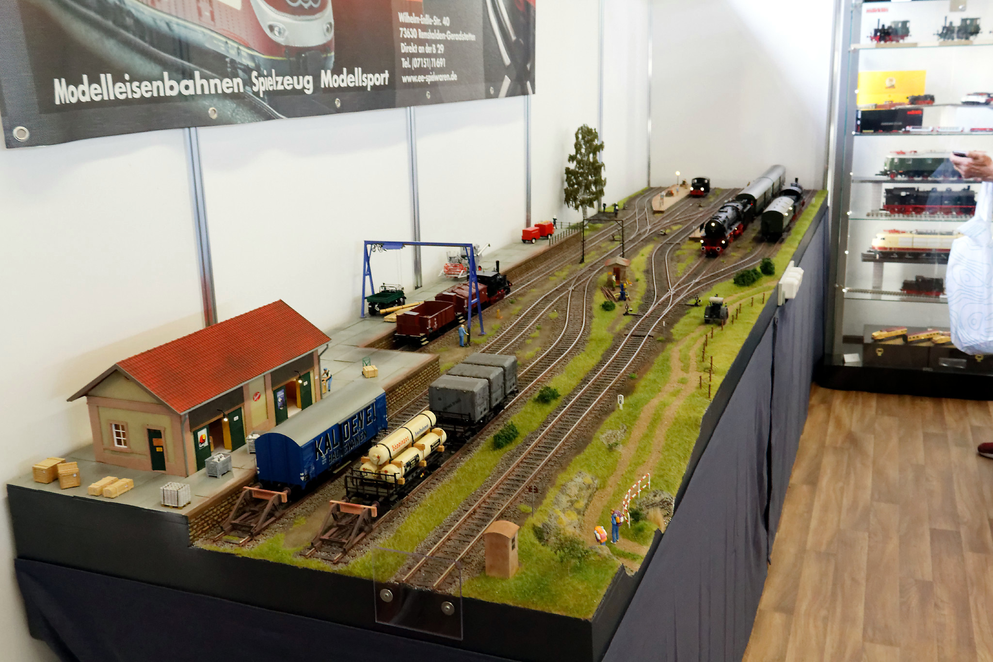 Die neue Spur-1-Anlage am Stand von E+E Spielwaren auf der Leistungsschau Remshalden: Der Güterschuppen mit funktionsfähigem Bockkran ist der Mittelpunkt des Rangierverkehrs, während im vorderen Bereich die großen Schlepptenderdampfloks das Betriebsgeschehen dominieren.